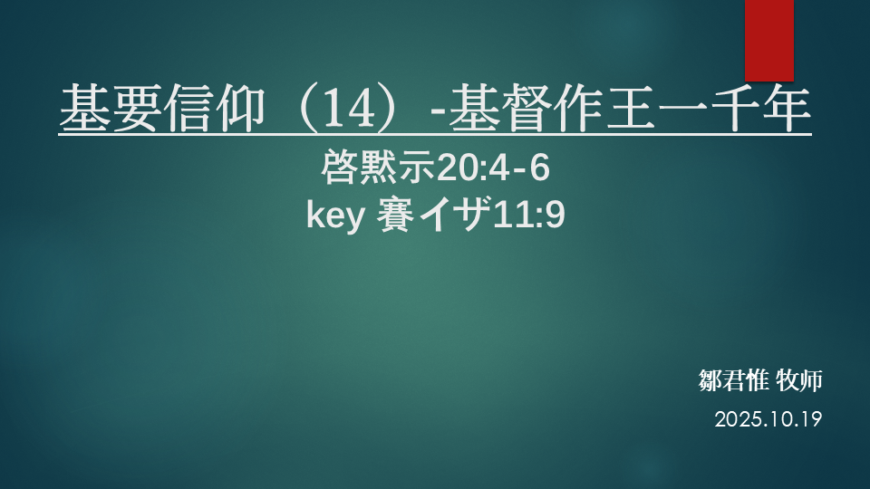 啓黙示20:4-6 key 賽イザ11:9 一、再臨的盼望/再臨の望み 1.嘆息的世代/嘆きの時代 (伝道1:14) 2.再臨的確信/再臨の確信 &... -